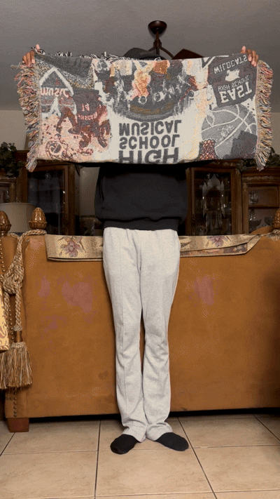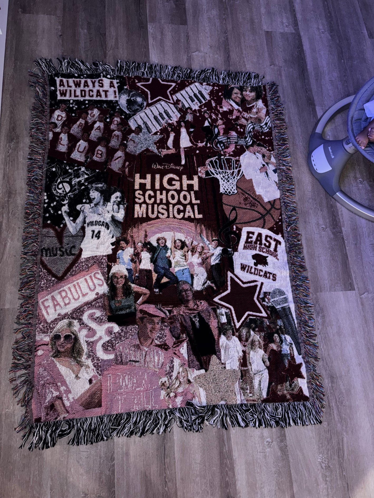 The hsm blanket is honestly one of the coolest things I have ever bought seeing it laid out on the floor shows how detailed and clean the design really is and the colors pop so much the woven material feels strong and soft at the same time and it instantly reminds me of watching the movies as a kid it feels like owning a piece of real high school musical history